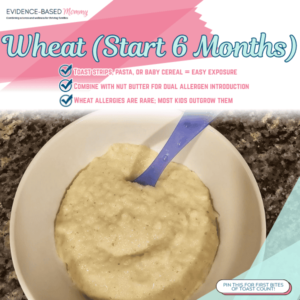 Those first bites of toast absolutely count as allergen introduction. Wheat is one of the easier allergens to introduce because it’s in so many foods babies naturally try. Small pieces of whole wheat toast, pasta, or even baby cereal all work. Make toast strips by cutting bread into finger-length pieces that your baby can hold. You can spread a thin layer of nut butter on toast to knock out two allergens at once. Wheat allergies are pretty rare, affecting less than 1% of children, and most kids outgrow them by school age. The difference between wheat allergy and celiac disease matters: wheat allergy causes immediate reactions like hives or breathing trouble, while celiac is an autoimmune response to gluten that develops over time. Your pediatrician can test for celiac if you have concerns based on family history.