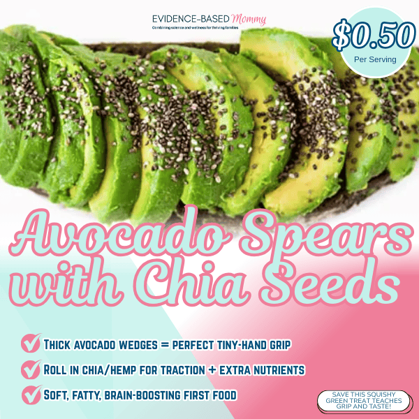 Wondering what to serve when your baby is just starting BLW? A ripe avocado cut into thick wedges (about the size of your pointer finger) is perfect for tiny hands learning to grasp. The fat supports brain development, and rolling the slippery pieces in chia seeds or hemp hearts gives a better grip while adding extra nutrition. Look for avocados that give slightly when pressed but aren’t mushy. Cut them lengthwise into 4-6 wedges, depending on size, and leaving some peel on one end as a natural handle makes it easier for 6-7-month-olds to hold. It’s completely normal if more avocado ends up smashed into the high chair than in your baby’s mouth at first. That squishing and exploring teaches them about texture, which builds the foundation for actually eating later.