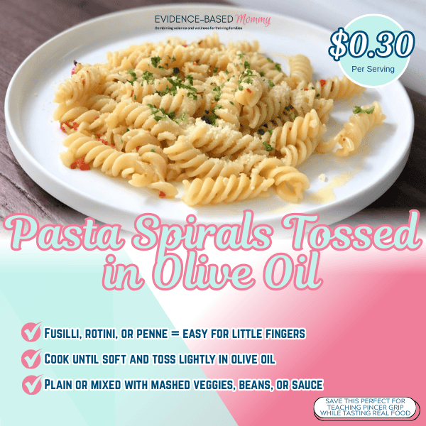 Regular pasta from your pantry makes an excellent BLW lunch, and you don’t need special baby pasta. Fusilli, rotini, or penne work beautifully because babies can grip the ridges and shapes. Cook it slightly longer than al dente so it’s soft enough to gum, then toss with a tiny drizzle of olive oil or butter to prevent sticking. You can add whatever you have: marinara sauce, pesto, mashed white beans, or just leave it plain. Babies often prefer plain foods as they’re learning. Serve it at room temperature, which is usually when your baby actually gets to eat anyway. If your little one only eats two pieces and flings the rest, that’s totally normal for this age. They’re learning to pincer-grasp those slippery shapes, and that practice matters just as much as the eating itself.