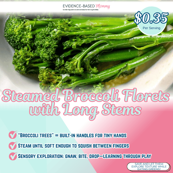 Steam broccoli until it’s soft enough that you can easily squish it between your fingers, usually about 8-10 minutes. Leave 2-3 inches of stem attached because that gives your baby a perfect handle to grip while they gnaw on the floret top. The stems should be tender all the way through, which you can test by piercing with a fork. Broccoli trees (as many parents call them) fascinate babies, and the little bumpy texture on top is interesting to explore. Your baby will likely suck on the floret, maybe bite off tiny pieces, and definitely drop most of it on the floor. That’s all part of learning. Serve it plain or with a tiny bit of butter. If your baby makes disgusted faces but keeps picking it up, that’s curiosity, not rejection. They’re figuring out this new taste and texture through repeated exposure.